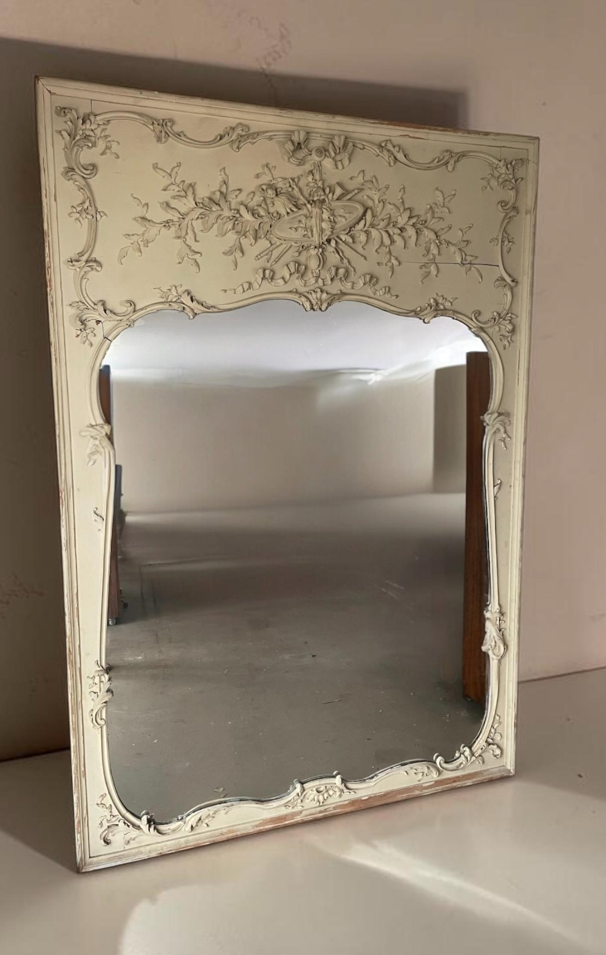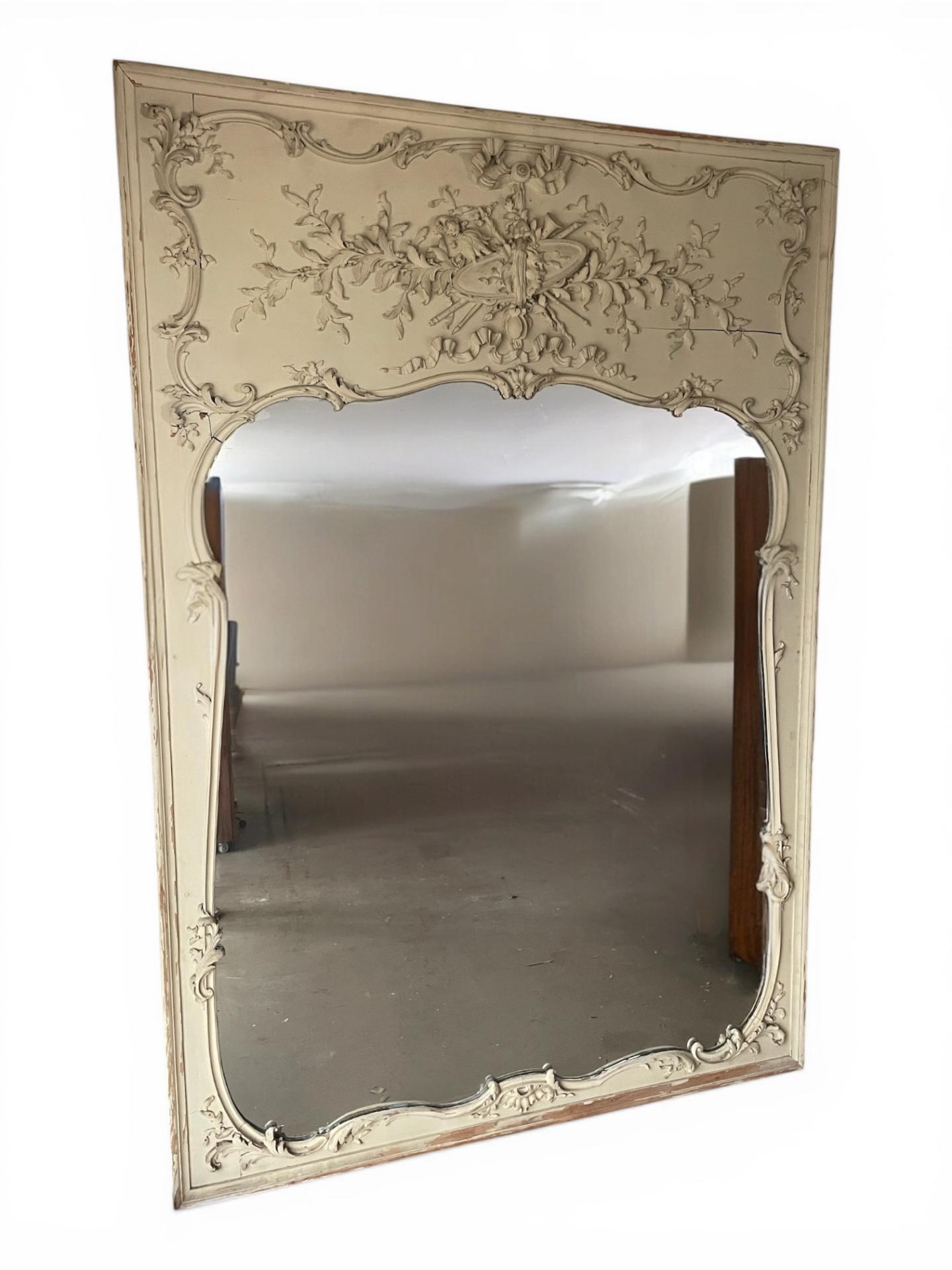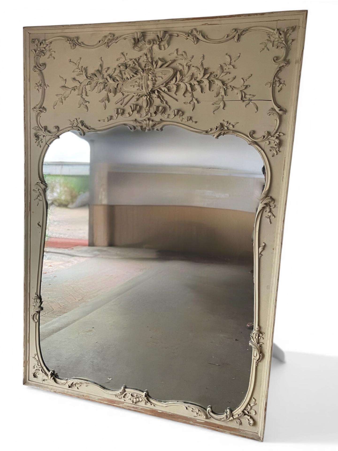 Large Louis the XV style trumeau mirror with surrounding hand carved acanthus leaves.