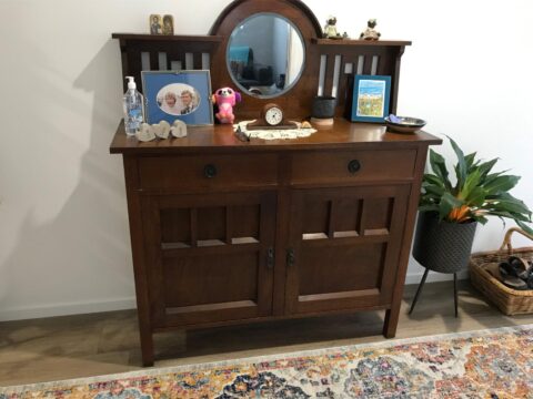 The new mirror is meticulously installed and aligned to maintain the furniture’s authentic look.